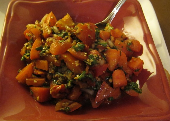I am a salad queen….I love a good salad and am constantly trying different combinations of ingredients to find new combos and flavors that go well together. I love making dressings, again to find new flavors combinations that I otherwise wouldn’t find together, and I try to have a very light hand with dressing, allowing the true flavors of the salad to shine. I am also a bread girl…though I know the Atkin’s lovers curse a warm piece of baguette right out of the oven. I saw life is too short to not enjoy the things you love….but you can do so healthfully and in moderation. These recipes are great go to any time of the year, but the crostini really excels in the middle of the summer when locally grown tomatoes are available in abundance. You can also use firm Roma tomatoes for the crostini if that is the best available.