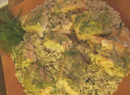 We served this on a bed of Israeli couscous with lots of herbs and an earthy Oregon 2006 Pinot Noir from Lange. Salmon can easily be paired with red wine, as it has a higher fat content than white fish, balancing with the fruit and tannins. This one from Willamette Valley is filled with earthy forest floor, strawberry and herbal notes, making it an ideal pairing with this dish. I visited Lange about 6 years ago and had a fanatstic picnic at their winery overlooking the lush Willamette Valley vineyards below. The setting is as beautiful as their wine.