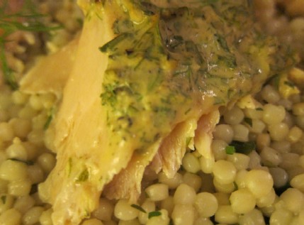 Add the lemon juice and white wine to a large baking dish. Rub the lemon zest, shallot and garlic into the flesh side of the salmon. Place the salmon, flesh side down, into the wine and lemon juice and marinate in the refrigerator for about 20 minutes. While the fish is in the marinade, blend the herbs with the mustard and set aside. Remove and drain off most of the marinade and flip the salmon over. Preheat the oven to 375. Season the salmon with the salt and pepper. Generously coat the flesh side of the salmon with the mustard mixture. Roast for 13-15 minutes, keeping the salmon slightly undercooked in the center. Serve on a bed of couscous.