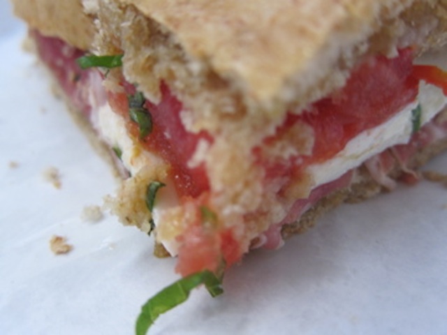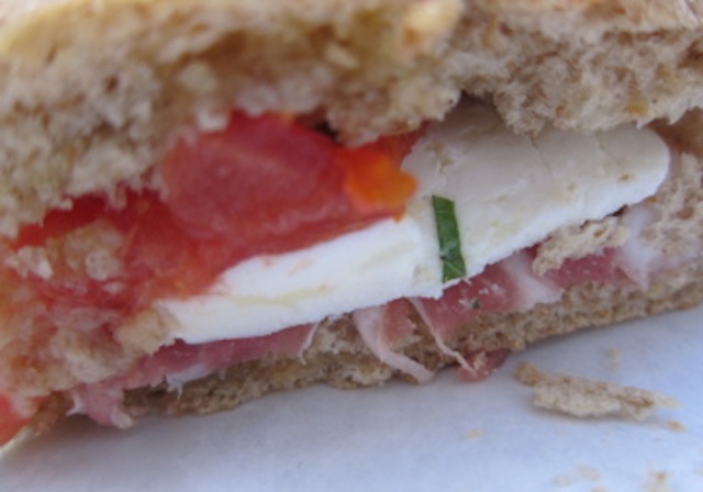 The result…a massive tomato, mozzarella and prosciutto sandwich with fresh basil on a whole wheat muffaletta bun with just a touch of fruity Italian olive oil and a dash of balsamic vinegar and cracked pepper.