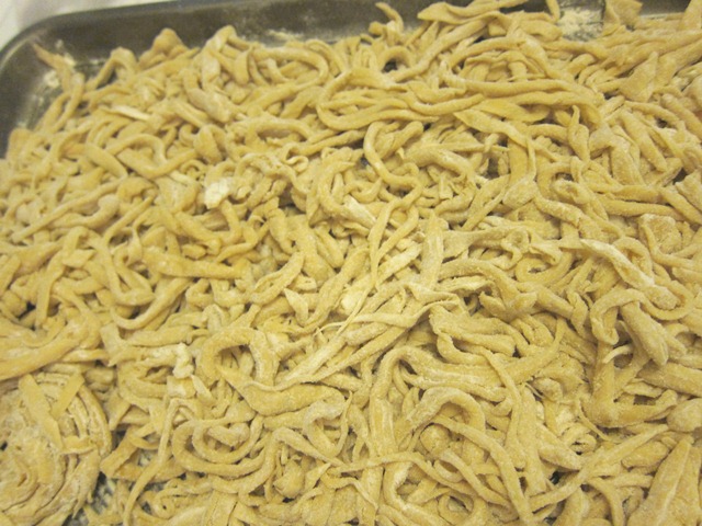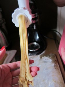 We opted for the attachment, but still had to cut the pasta into strips as ours was sticking a bit. We liked it though, it made a much more organic and free for all pasta. Set pasta on a floured sheet and dust lightly with flour, then cover with a damp cloth until ready to use. Fluff the past about every hour just to make sure it isn’t sticking together.
