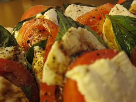 The Caprese salad is one of the easiest in the world to make. If you can layer on a diagonal you can make this salad. I like to season my tomatoes before I layer to make sure they have lots of good flavor, so lay all the tomatoes out on your cutting board and sprinkle lightly with a bit of salt and pepper. Then, on your platter simply begin layering a tomato slice, then a mozzarella slice, then a piece of basil, then another tomato, mozzarella, basil, tomato, etc. Layer each piece on a diagonal almost so it slides or fans out on your plate. When all the slices are layered sprinkle a bit more pepper over everything and drizzle with the olive oil and balsamic. You could also top with a bit of fresh pesto if desired. Serve.