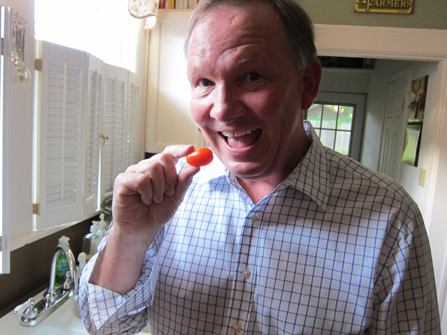We planted a big barrel of grape tomatoes and what our garden expert called “easy patio tomatoes” what seems like forever ago (maybe 2 months ago) and for the past two months Gary has pampered this pot with tender loving care, giving it special tomato food, watering it gently, staking the vine when a few were hurt during the storms a few weeks ago. He has handled these plants with true tender loving care, as he has all of our yard. Today we finally have picked and just tasted our first tomatoes of the season. We have many more that are growing fast and changing from their subtle green color to golden to red, but we finally had our first bite.