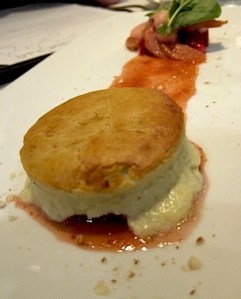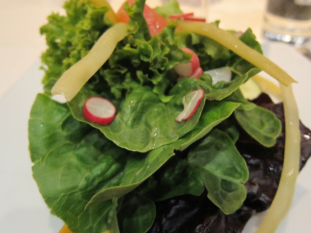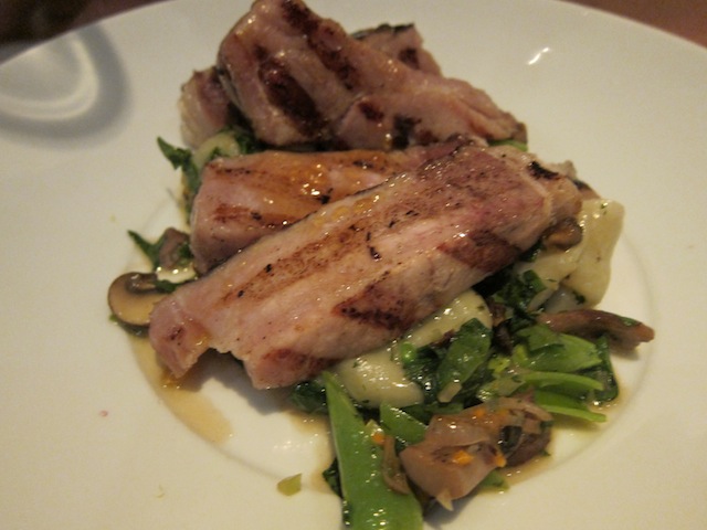 To our delight, we had a fantastic server who knew her stuff and was entertaining to boot. We opened with a glass of Ojai Bien Nacido Vineyard Chardonnay from Santa Maria Valley. I loved that most of the wine list featured wineries from the region, with this one shining with ripe pear, candied lemon peel and citrus flavors with a layer of toasted vanilla. Great on its own or with a starter course like our miniature Maytag blue cheese souffle presented beside a rhubarb and strawberry compote. Airy and delicious, with a slightly acidic bite from the compote. And incredibly seasonal as rhubarb was everywhere that weekend. Over a bottle of Qupe Syrah we enjoyed main courses of a roasted pork chop over incredible fava bean tortellini (something I would like to reinvent) with mushrooms and herbs, a Caesar salad with a poached farm egg and an incredible Heirloom vegetable salad filled with local lettuces, baby radishes, beans and more, but no tomatoes…again, because they weren’t at their optimal ripeness.