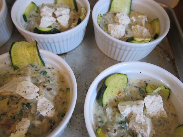 6 large zucchini – slice 3 directly in half lengthwise, slice the other 3 in long strips lengthwise to layer into ramekins