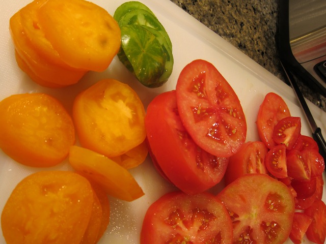 I wrote the other day about our trip to the Kona farmer’s markets, but have to reiterate as we then came home ad enjoyed the bounty of the Big Island. Though I will say Tom Spicer is the king of great greens, the flavors we tasted of heirloom tomatoes and beefsteak tomatoes, English and Japanese cucumbers, peppery radishes, fresh basil with massive leaves and local arugula may take the prize for best flavors, inspiring any kid (or Gary) to eat their veggies. Add a little cheese, balsamic or sherry vinegar and fresh olive oil and a perfect dinner is born. Bravo Hawaii Island…we do love you so!
