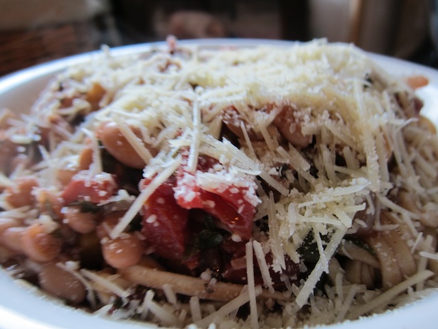 Bring a medium size stock pot filled with salted water to a boil. Meanwhile heat the oil over medium heat in a large saute pan. Add the onion, zucchini and garlic. Saute for about 5 minutes until just getting tender. Add the mushrooms, yellow pepper, Italian seasoning, a good few cracks of pepper and red pepper flakes and continue to cook for 2 minutes. (Do not add salt until after you have added capers and anchovy paste and then adjust to your taste…both are very salty.) Add the tomatoes w/ the juice from the can, with the Worcestershire, red wine and anchovy paste. Cook bringing the flavors together for about 5 minutes. Add capers, beans, sun-dried tomatoes and fresh herbs. Cook together for about 3 minutes, then adjust the seasoning. Meanwhile, once the water is boiling, drop the pasta into the water with a bit of oil (to keep it from sticking together.) Cook the pasta for 3-5 minutes, until just tender. Drain the pasta reserving a bit of cooking water (about a cup) and drop the pasta into the sauce. Cook together for a few minutes, finishing the pasta’s cooking and marrying the flavors. Scoop into pasta serving bowls and garnish generously with Parmesan cheese.