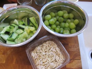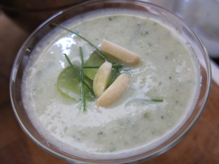 We had some friends over for Gary’s surprise birthday party earlier this week and I had Spain on the mind so decided to create White Gazpacho and Paella, with my own twists. I have only had a few versions of White Gazpacho in the past, and always thought they were heavier than I had hoped for in a cold soup. This one was light, refreshing, delicious and relatively easy as long as you have a good blender.