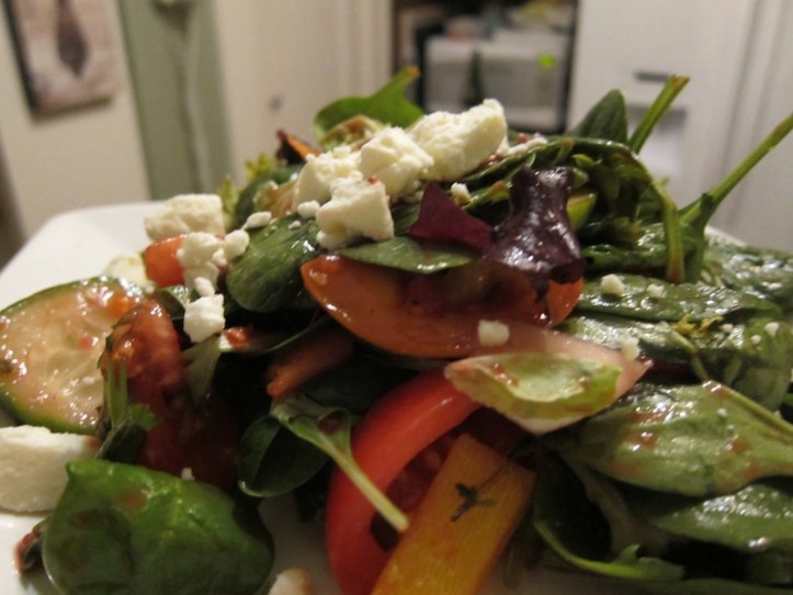 For the dressing, combine all the ingredients in a jar with a tight sealing lid. Secure the lid and shake vigorously to make sure everything is well combined. Set aside until ready to use. Add all of the salad ingredients to a large bowl (big enough to be able to toss the salad in the bowl) except the feta. Add about 1/2 of the vinaigrette to the salad and begin to toss to coat with the dressing using salad tongs. Add additional dressing to your taste. Plate the salad individually, topping each serving with a good sprinkle of the feta; or serve family style with the feta sprinkled over the top of the whole salad.