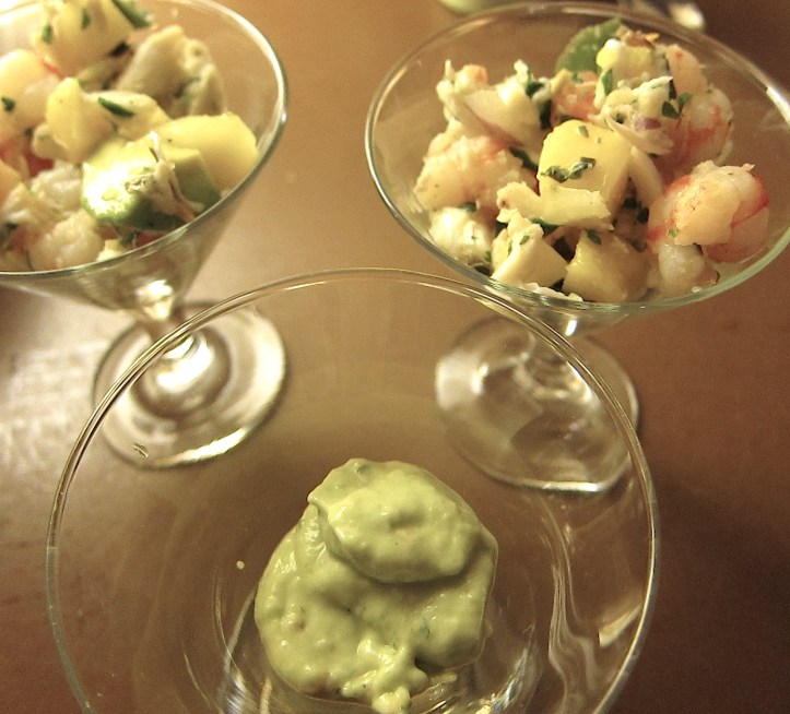 This starter was a big hit at a dinner we did a few weeks ago, with fresh tropical fruit and citrus flavors, plump rock shrimp and a touch of creamy avocado with just a bit of lump crab meat. I love rock shrimp, I think it has an intense sweetness that is simply divine in dishes like ceviche. I barely poach it in a spicy shrimp boil prior to folding it into the fruit and citrus. We layered the avocado on the bottom of the mini martini glass serving dish and added the ceviche on top, creating a bit of a surprise with each delicious bite.
