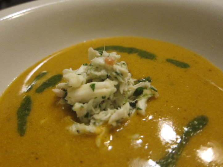 Coconut Carrot Ginger soup with Fresh Ginger Lump Crab Meat and Cilantro Oil