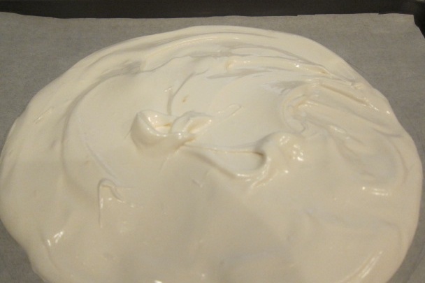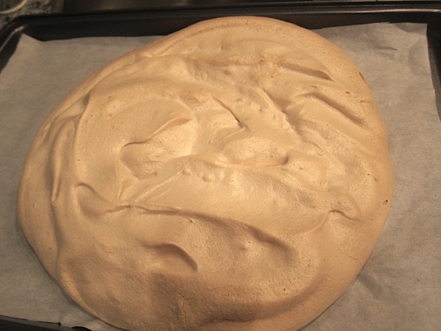 Line a baking sheet with a piece of parchment paper. Carefully mound the egg whites into the center of a parchment in a round, uniform mound. Place in the oven at for 50-55 minutes, or until it is nicely browned, then turn oven off and let it sit in the oven for about 30 minutes as it starts to cool.