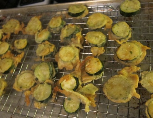 For the zucchini – Combine the flour, cheese and spices together then add to the beaten egg yolks. Stir to combine. Add the oil, beer and season with salt and pepper (about 1/2 teaspoon of each or to your taste) stir to combine. Then fold in the whipped egg whites, combining thoroughly. Pour canola oil into a deep saute pan about 2 inches high then set over medium high temperature. Test the heat of the oil by dropping a bit of batter into the fat, if it sizzles and cooks quickly the oil is ready. Carefully dip each slice of zucchini in the batter (we used kitchen tongs) and lay in the oil. Cook about 3-5 minutes on the first side, until golden brown, then flip and cook about 3 minutes on the other until both sides are very brown and toasty.