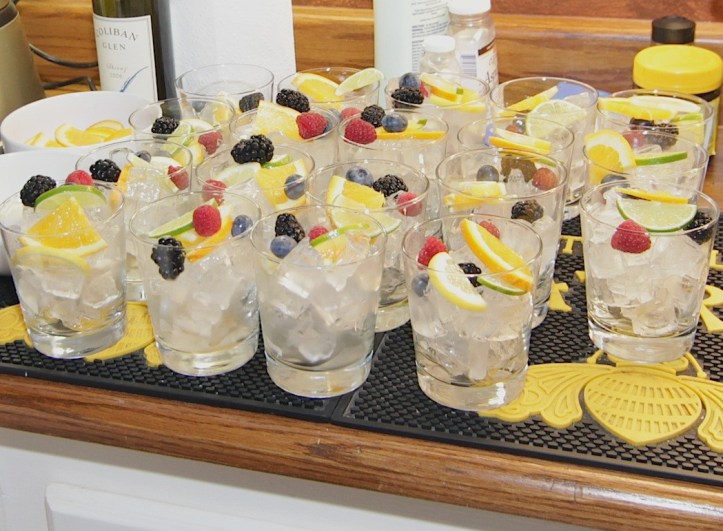 Stir all of the liquid together in a large container and refrigerate for an hour or two before serving. We had such a large crowd that we wanted to make sure everyone got some fruit so we added the fruit to each glass; if adjusting for a smaller crowd add the fruit to the pitcher and muddle it a bit before adding ice to help it break down into the sangria. Serve over ice in rocks glasses.