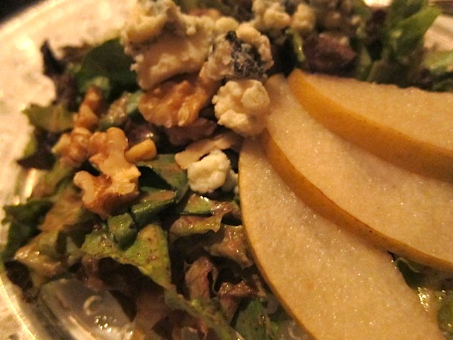 Spicer Greens with Fig Vin, Asian Pear, Gorgonzola and Walnuts with Domaine du Tariquet Uni Blanc/Colombard white blend, proving that an unusual combo can create a most surprising pairing; most of the guests had not heard of either varietal before, but loved the pairing.
