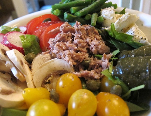 I recreated the “Sicilian” salad inspired by the Milan Airport last week, adding a few dolmades and white beans to take me back to Greece as well, along with steamed green beans, mushrooms, radishes and capers. Simple yet incredibly tasty.