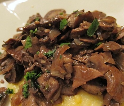 For the polenta – Heat 1 tablespoon of butter in a large Dutch oven and add the onions, garlic and corn with any milk that may have accumulated. Cook for about 5 minutes until the onions are soft. Add the stock to the pot and bring to a low boil. Carefully whisk in the polenta, whisking well to incorporate. (Be careful, the polenta will immediately start to pop and may burn you if your not careful.) Turn the heat to a low simmer and cook the polenta for another 20 minutes, until soft, stirring often to make sure it doesn’t stick. Season generously with salt and pepper (about a teaspoon or two of each, to your taste.) If the polenta is too thick you can always add more stock or water. Polenta will soak up any liquid you add, so it is fairly fool proof in that regard. After about 20 minutes whisk in the half and half or milk. Adjust any final seasonings, allowing it to cook for about 5 minutes more. Stir in the tablespoon of butter and the Parmesan and serve in big spoonfuls on the bottom of each dinner plate. Top with a hearty ladle of the roasted mushrooms and a drizzle of mushroom jus. Add a few roasted lamb chops if desired.