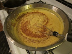 Combine the heavy cream and pumpkin in a sauce pot and bring to a boil, stirring often to help the pumpkin melt into the cream.  Turn off the heat and add in the Amaretto and vanilla.  Set aside to cool.  Over a double boiler with the water at a high simmer underneath add the egg yolks and sugar.  Whisk constantly for the next 8-10 minutes until the sugar melts into the eggs and thick yellow ribbons begin to form when the whisk is lifted from the mixture.  (Do not leave alone or the eggs will begin to curdle.)   When the ribbons have formed, slowly begin to incorporate the cream mixture, whisking continuously.  Whisk to combine.  Continue whisking every 3 or 4 minutes for a minute or two to ensure the mixture isn’t curdling and staying silky.