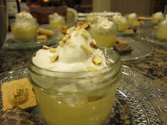 I catered my first official dinner party the other evening…though we do a lot of charity dinners that we cook for, and entertain a ton at the house, this was my first dinner as a hired hand….and man was it fun!  14 total guests, plus my Gary who told stories about movieland all night as the guests enjoyed four courses of delights, ending with this little gem….Pumpkin Pots de Creme with Spiced Whipped Cream.  Heavenly layers of creamy pumpkin with just the right amount of spice, and a good kick of Amaretto just to liven it up a bit.  Top with a few crushed almonds and this was the ideal ending to a fall dinner, and hopefully the beginning of a new revenue stream….