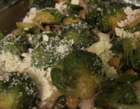 Fill a stock pot with water and salt generously. Bring pot to a boil then drop the sprouts in and cook for about 5-7 minutes until softened but still bright green. Drain well and pour into a baking dish. Heat the oven to 400 degrees. Meanwhile add the spices to a pan and heat over very low heat for about 2 minutes. Do not let it burn. If you have whole spices you can use whole spices and toast for a bit longer then pour into a spice mill and grind, but you can easily use ground spice and just heat slowly for a few minutes. Add the garlic and onion to the sprouts with the beans and toss with 1 tablespoon olive oil, vinegar and the citrus juice. Then toss with the zest, spice blend and season generously with salt and pepper. Drizzle the wine over the sprouts and add them to the oven. Roast for 15 minutes or until slightly golden and caramelized. Top with cheese and serve either warm or at room temperature. You can also top with chopped bacon, cooked until very crispy….as bacon makes anything better….