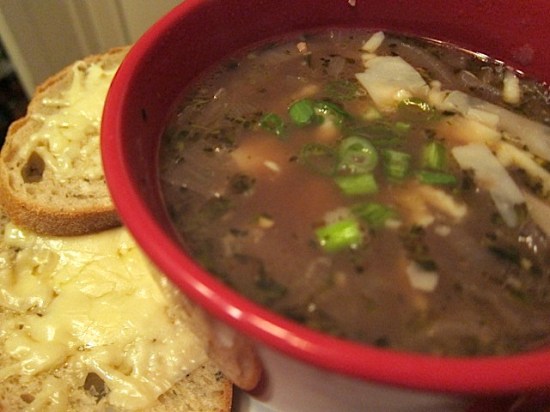 Mushroom and Onion Soup with Rosemary Cheddar Toasts