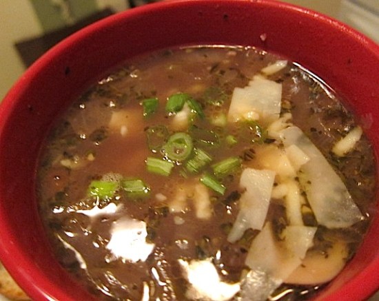 Preheat oven to 350 degrees. Heat two tablespoons butter in a large dutch oven and add the onions and cook over medium heat until the onions start to caramelize and get very soft. Add the mushrooms, garlic and a touch of chicken stock with the vinegar and Worcestershire and cook until soft, about 5 minutes. Then add the herbs, pepper flakes, wine, beef broth and rest of the stock and bring to a boil then simmer for 20 minutes. Season to taste (the broth and the stock are generally salty so seasoning at the end will ensure the soup isn’t too salty.) Meanwhile combine the remaining tablespoon of butter, softened, with the shaved cheddar cheese and divide on the top of the 4 slices of bread. Place on a baking sheet and into the oven. Cook until well toasted and crunchy. Season lightly with salt and pepper. Spoon a heaping ladle of soup into bowls and top with chopped fresh scallions and shaved parm. Serve with the croutons on the side for dipping.