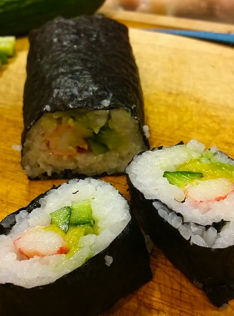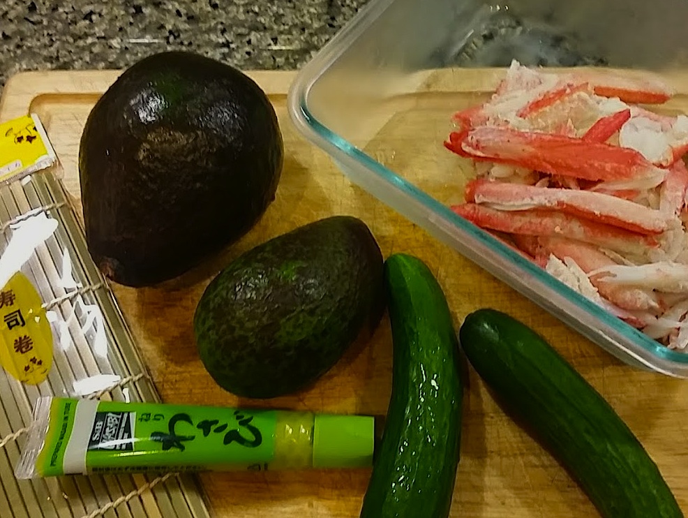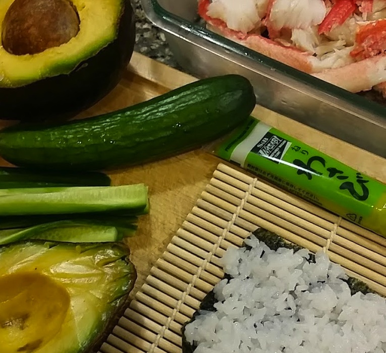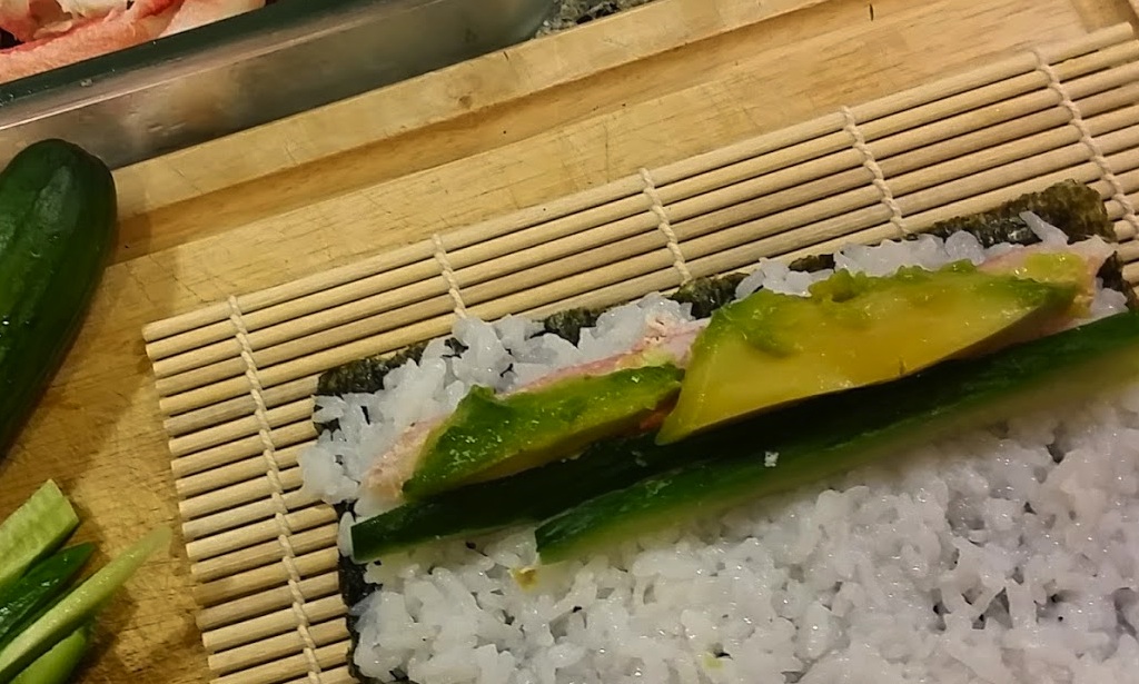 When a layer of rice is down place a line of crab meat across the Nori from left to right about 1/3 down from the top of the Nori/rice layer. Add a thin layer of wasabi over it (optional) then a layer of cucumber and then avocado. When you have layered your ingredients, carefully pick up the back of Nori sheet (furthest away from you) and gently fold it over the line of additional ingredients.