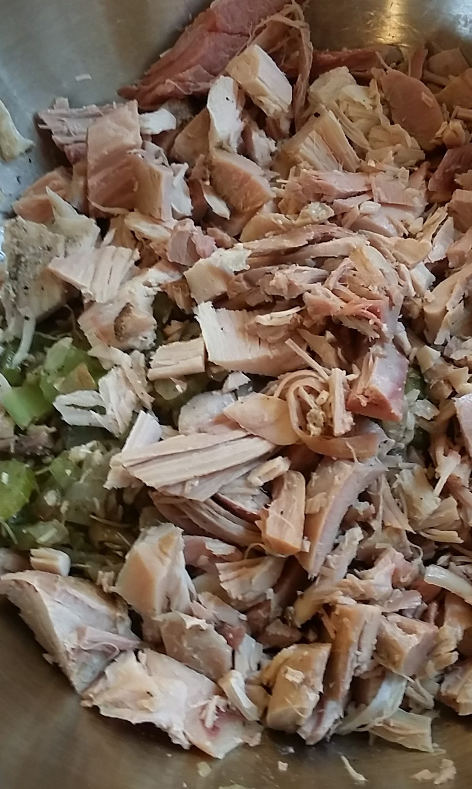 2 cups shredded turkey, we used both light and dark meat from the Greenberg turkey