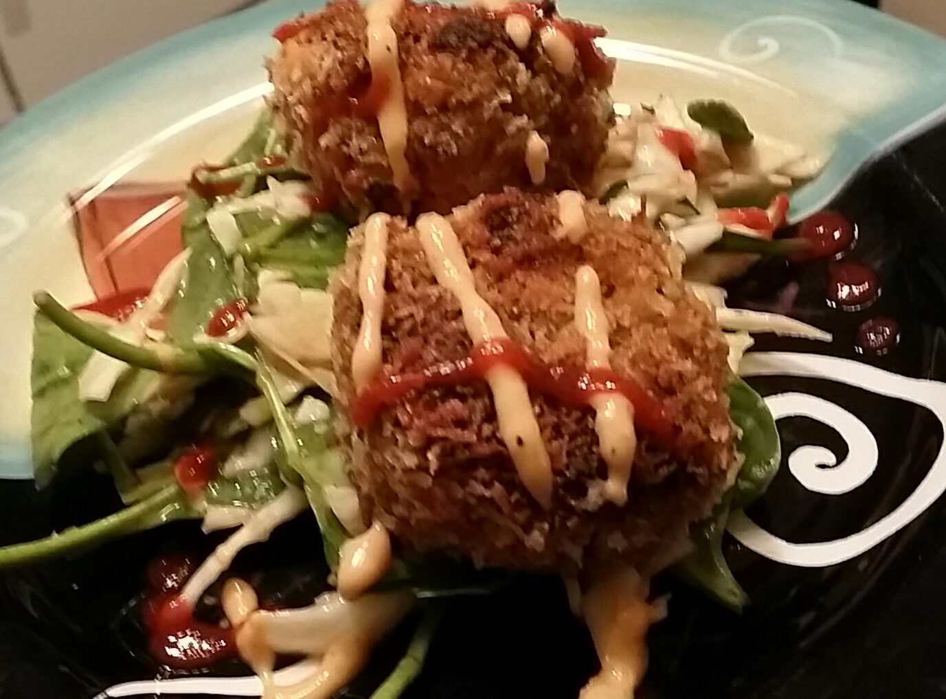 Serve by placing 2 cakes on each plate with a drizzle of the Siracha mayo sauce. If you like it spicy, add an extra drizzle of plain Siracha on top. Serve on their own or with an arugula & spinach salad and your favorite white wine.