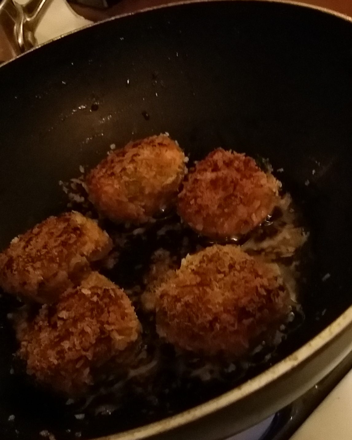 Add about a cup of oil to the saute pan over medium-low heat. Using an ice cream scoop or a spoon form the salmon into cakes, about 2 ounces each for larger cakes, or an ounce each for smaller. Place each on a baking sheet. Add the Panko to a bowl and roll the cakes in the Panko, placing each back on the sheet as you prep them all. Drop each cake in the oil and cook on each side, turning once, for about 2 minutes. Do not overcrowd your pan, prepare them in batches so all of them turn golden brown in their own time.