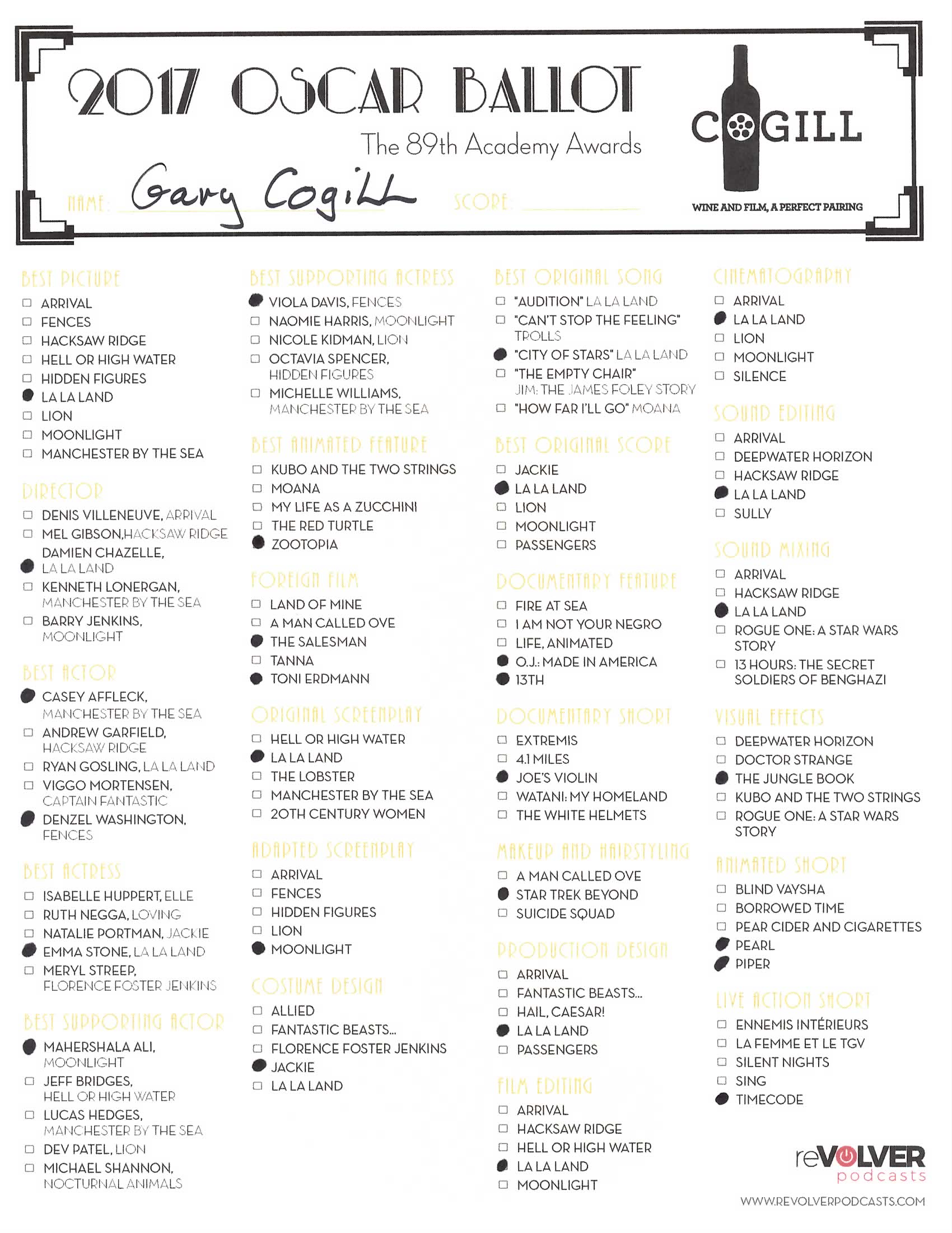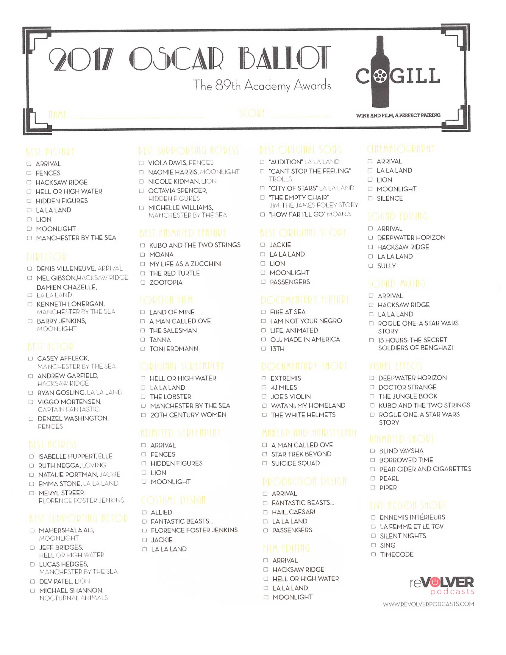 We have finally arrived at Oscar weekend and this week’s “Wine and Film, A Perfect Pairing” Podcaston reVolver Podcasts we talk through the whole ballot of nominees. From best film, best writing, best sound and more, Gary gives his official predictions for who this year’s winners will be. His ballot is below for reference, along with one you can print and use to make your selections this weekend.