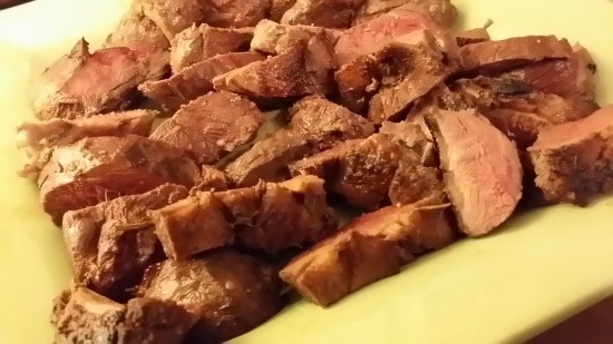 Don’t overcrowd your pan, use two pans if necessary to ensure even cooking. Cook for about 6-8 minutes, until the fat side is golden brown and most of the fat has rendered (cooked) off. Flip over in the pan and place in the oven until they reach an internal temperature of 135 degrees (maybe 5 minutes). Remove the pan, flip back over to the fat side and cook for 1 more minute just to give the fat a touch more crispiness. Remove the pan from the oven and let rest for about 5 minutes before slicing. Slice and serve with your favorite starch, like duck fat potatoes, buttery noodles, or herb infused couscous.