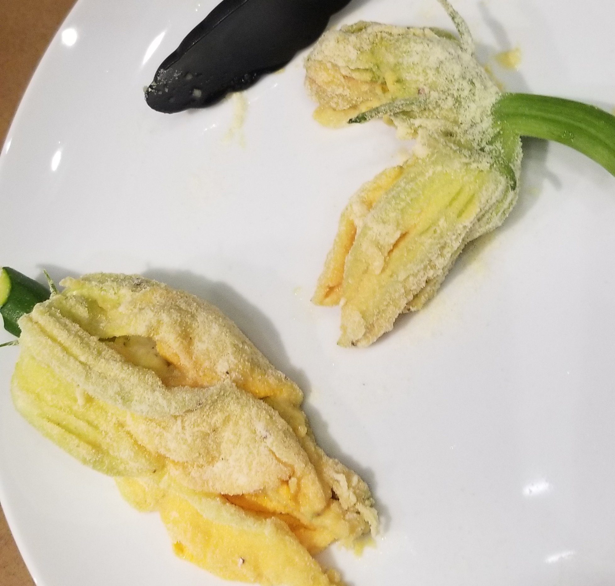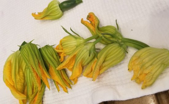10-15 squash blossoms (This time of year these are often sold in packages as farmer’s markets and specialty food stores, but you can also ask your local grocer to bring them in for you. They are often unutilized, as the actual vegetable is what is normally harvested, so you should be able to find them quite affordable.)