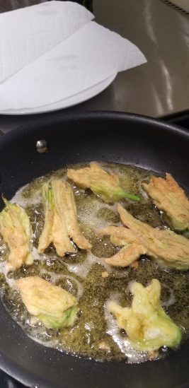 When the oil is hot (drop a bit of the flour in the oil to see if it fries easily) carefully begin frying, dropping a few flowers in the oil, making sure not to over-crowd the pan. When the blossoms are golden brown on one side, flip over using tongs and fry on the other until the entire blossom is golden brown. Remove from the oil and set each flower on paper towels, allowing them to drain slightly. Sprinkle with a touch of salt. Continue the process until all are complete.