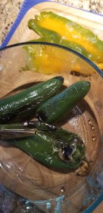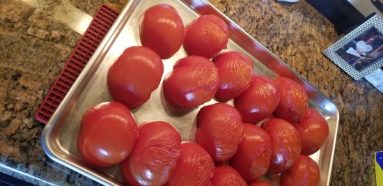 When the peppers start to blacken on top, carefully flip them over. When the peppers are fully charred remove them from the oven, place them in a small bowl and cover with plastic wrap. This will help you remove the skins. When the tomatoes have blistered remove them from the oven and place aside to cool before handling. The skins should be starting to peel away.