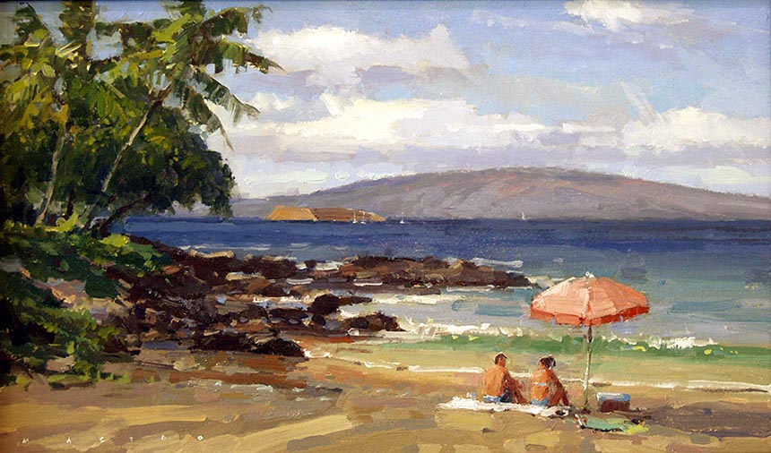 One that has me smiling today is Ronaldo Macedo’s “Mauied.” This original 12×20 oil on board transports you and your sweetie to a summer picnic on the Hawaiian island of Maui. Macedo is a Brazilian born artist living on Maui, painting the landscapes of the island, highlighting its character with an authentic sense of place.