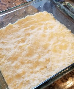 Preheat oven to 350 degrees. Mix the flour, confectioners sugar, and salt together then cut in the softened butter. Mix with a wooden spoon, or your hands, until a crumbly dough comes together. Don’t over mix. Butter and flour an 8×12 baking dish, then line with parchment paper. Press the mixture into the bottom of the pan. Place the baking dish in the oven and par-bake the dough for about 15 minutes, until just golden.