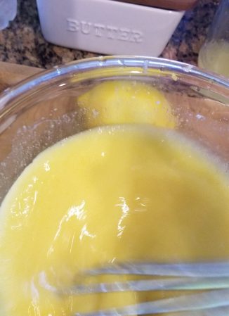 When the crust is lightly golden, remove from the oven and let cool slightly. Optional – If you wanted to add a layer of raspberry or strawberry jam in between the crust and the lemon mixture, spread a thin layer on the bottom of the crust.