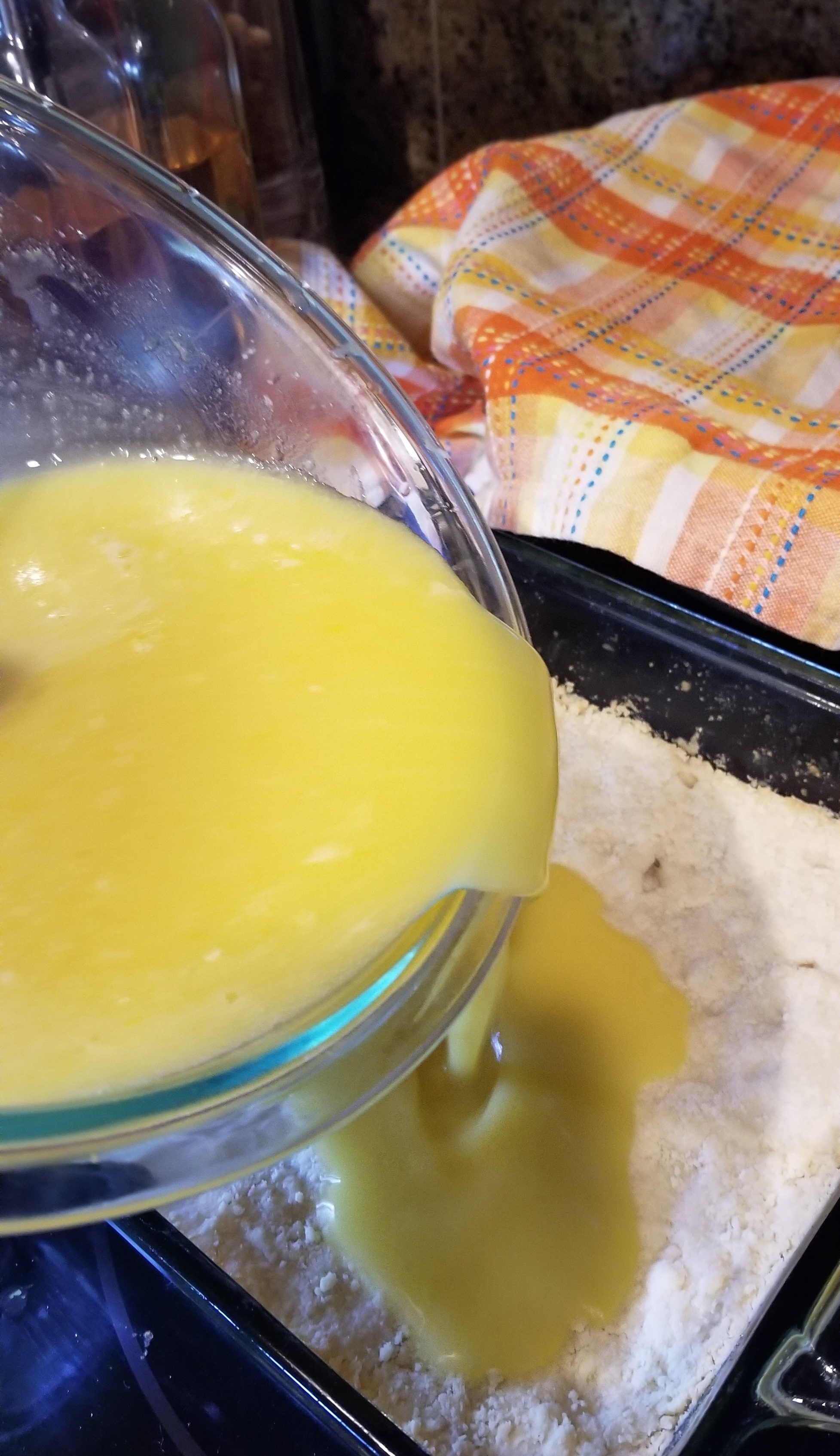 While the crust is cooking, whisk together the eggs, sugar, lemon juice and zest, vanilla, and salt. Add flour and baking powder. Whisk to combine. If you wanted to add any additional flavors, like lavender, mint, ginger, basil, thyme, etc., add now. Don’t overdo the additions though, the lemon is really the star.