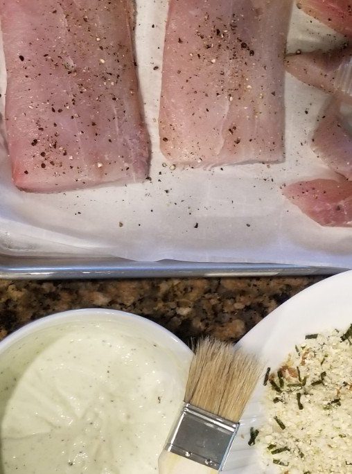 Four 6-8 ounce pieces of fresh flaky white fish, we have used Mahi Mahi and Ling Cod recently for this dish, but you could use halibut, ono, sea bass, tilapia, etc.